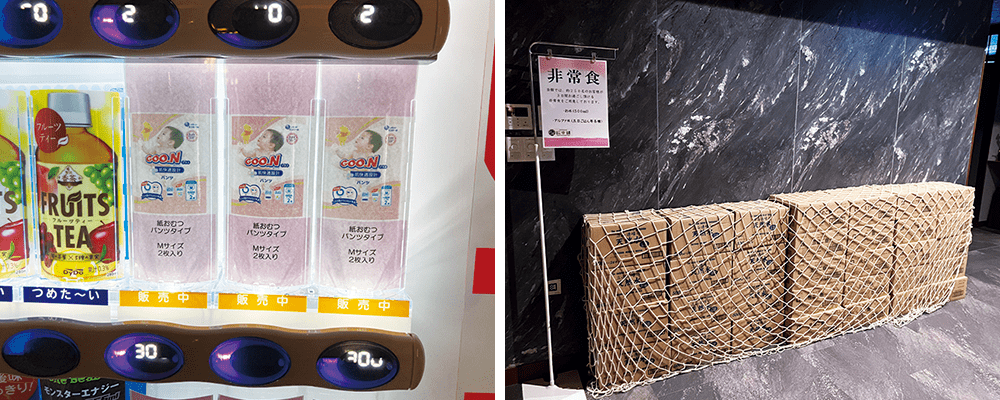 右/備蓄食糧は倉庫保管とせず、宿泊客の共用スペースに展示