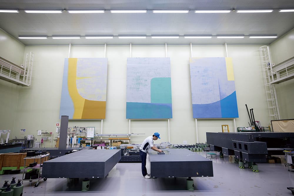 一枚の御影石を職人技で加工していく現場。窓のない作業環境を和らげるためにアートが飾られているのが印象的だ
