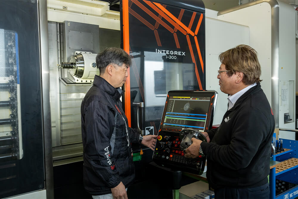 ラリーの経験を生かして、高い精度で加工ができるNC複合旋盤を使い、ユーザーのオーダーにきめ細かに応える。右が長瀬社長