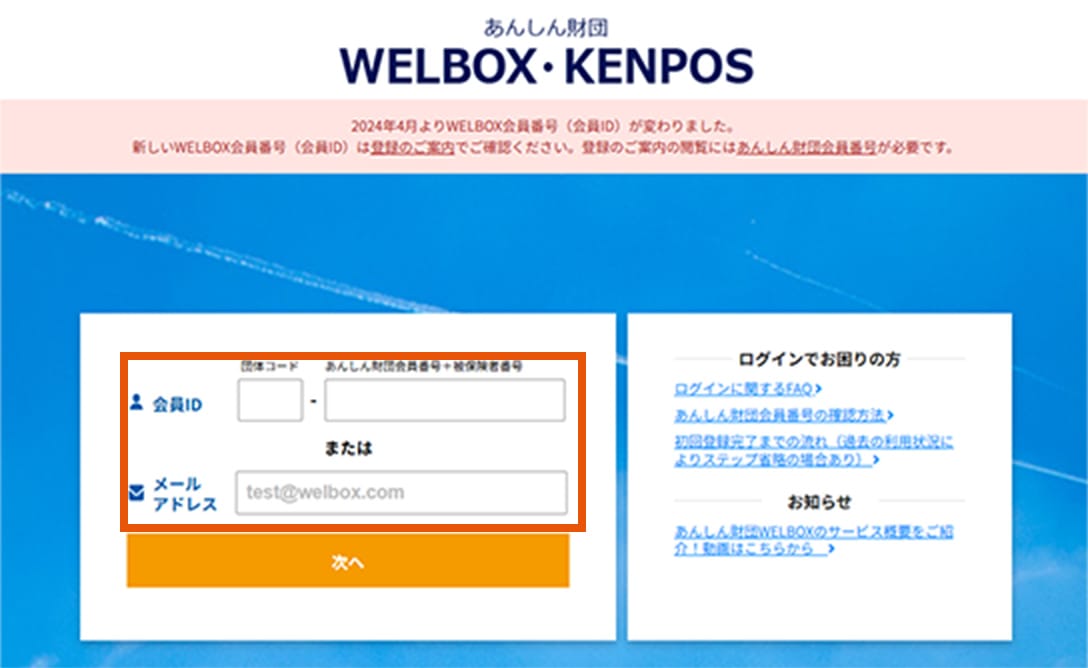 会員IDまたは登録済みのメールアドレスを入力し、「次へ」を押す。