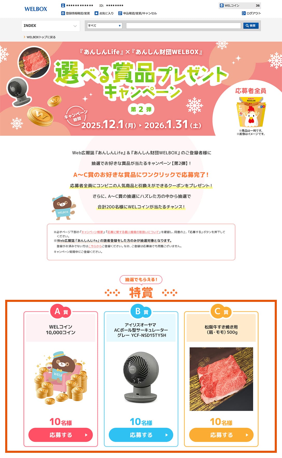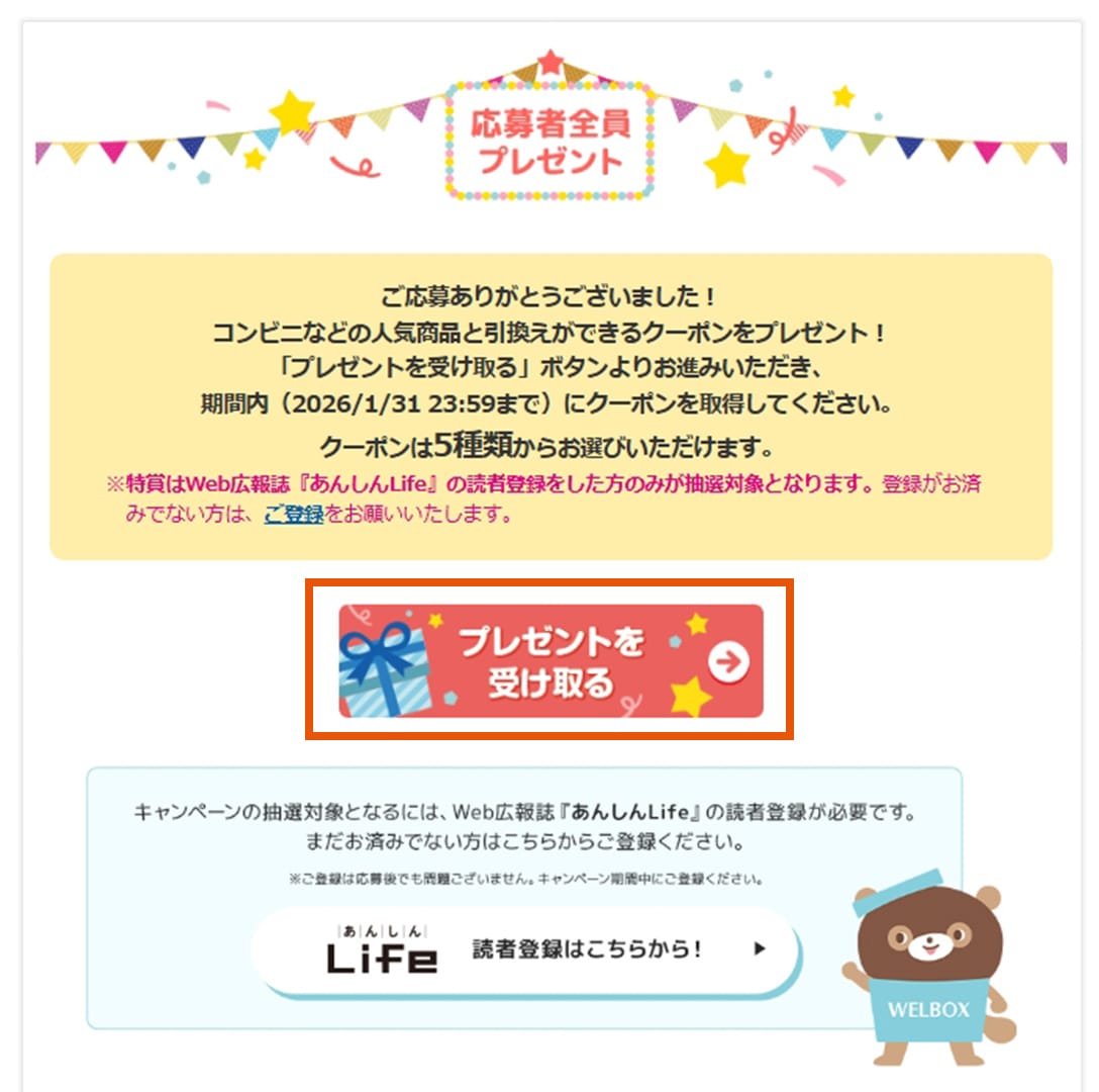 - キャンペーン期間よりも前にWeb広報誌『あんしんLife』および『あんしん財団WELBOX』に登録いただいている方も応募の対象となります。