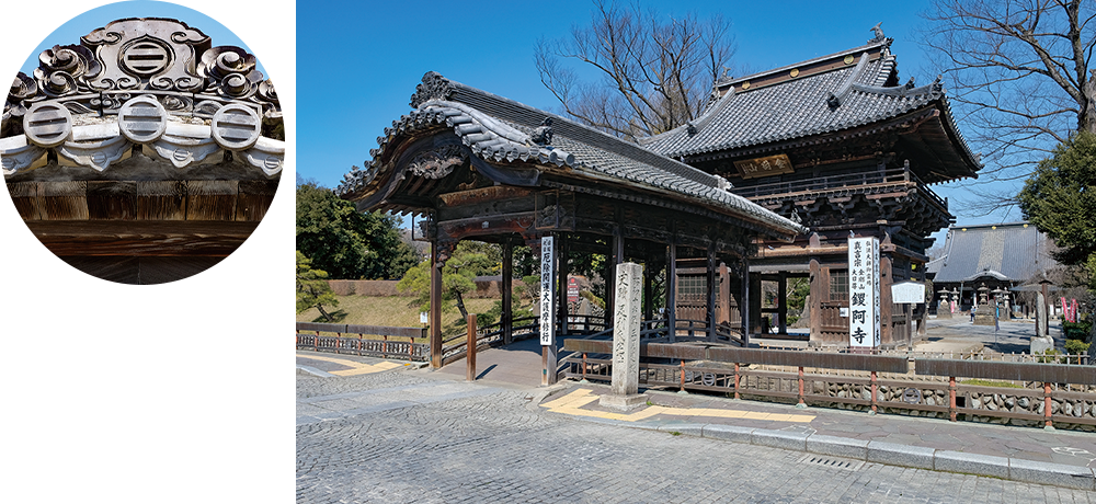 太鼓橋がかかる楼門は、県指定の重要文化財だ。鑁阿寺の正式な山門である。1564年に室町幕府13代将軍足利義輝が再建した。門の両側には仁王像が立ち、屋根には足利家の家紋"丸に二つ引"が施される。