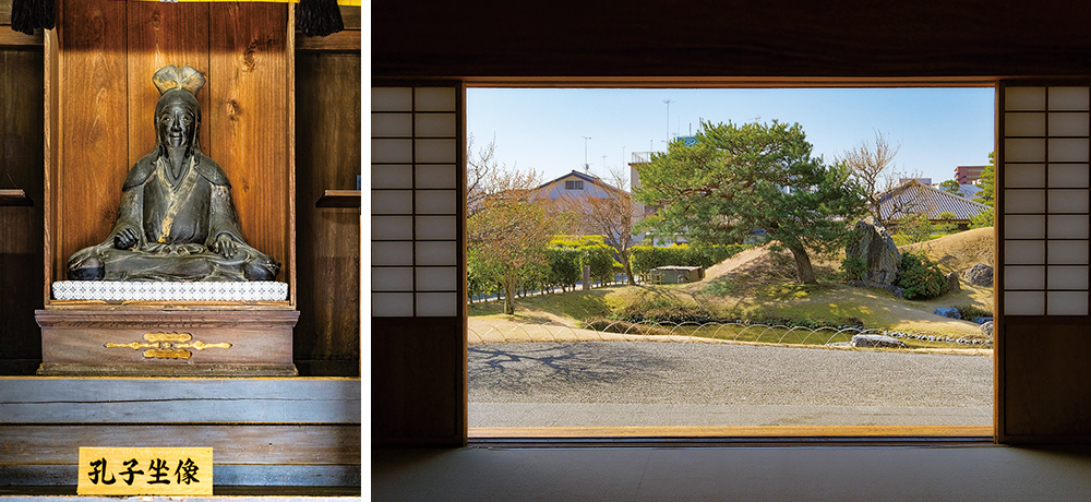 孔子の教えである儒学5つの経典のうち、4経の貴重な書籍が寄進され、国宝に指定されている。入り口から続く3つの門、入徳門、学校門、杏壇門をくぐった先には孔子廟があり、日本最古の孔子坐像がまつられる。頭巾をかぶり儒服をまとった行教像だ。座る孔子像は珍しい。