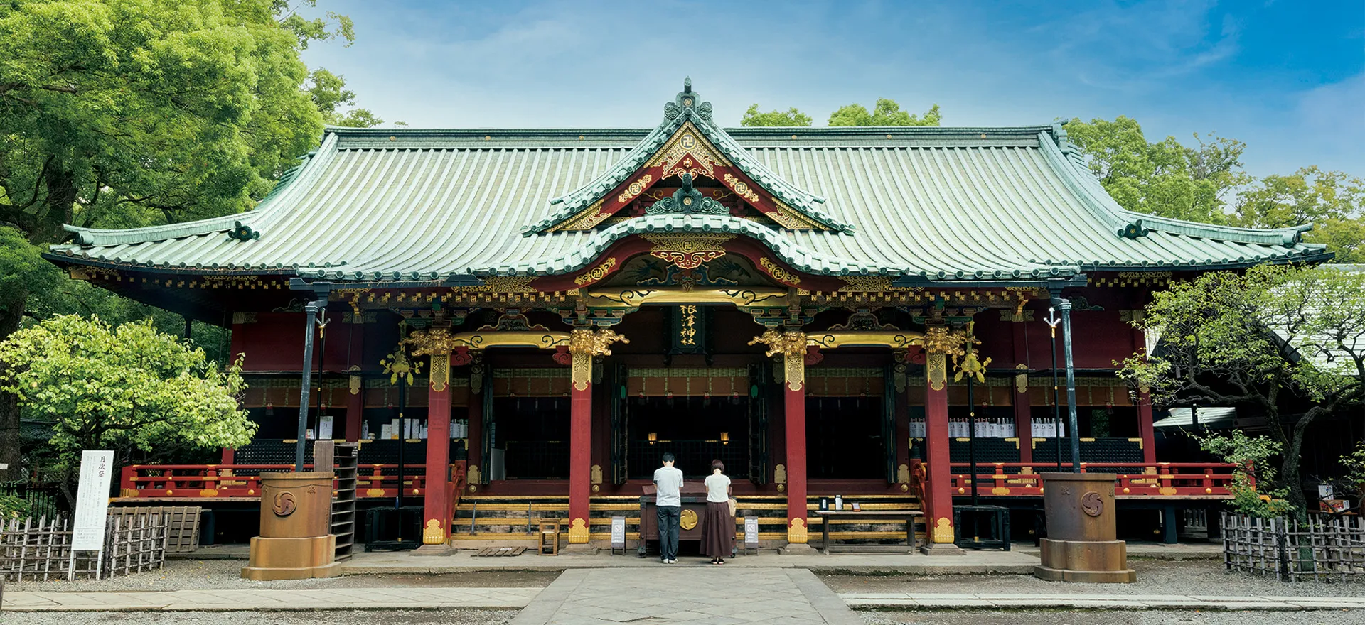 右/根津神社の拝殿。平安時代に始まり江戸時代に流行した権現造りの手本と賞される建物だ