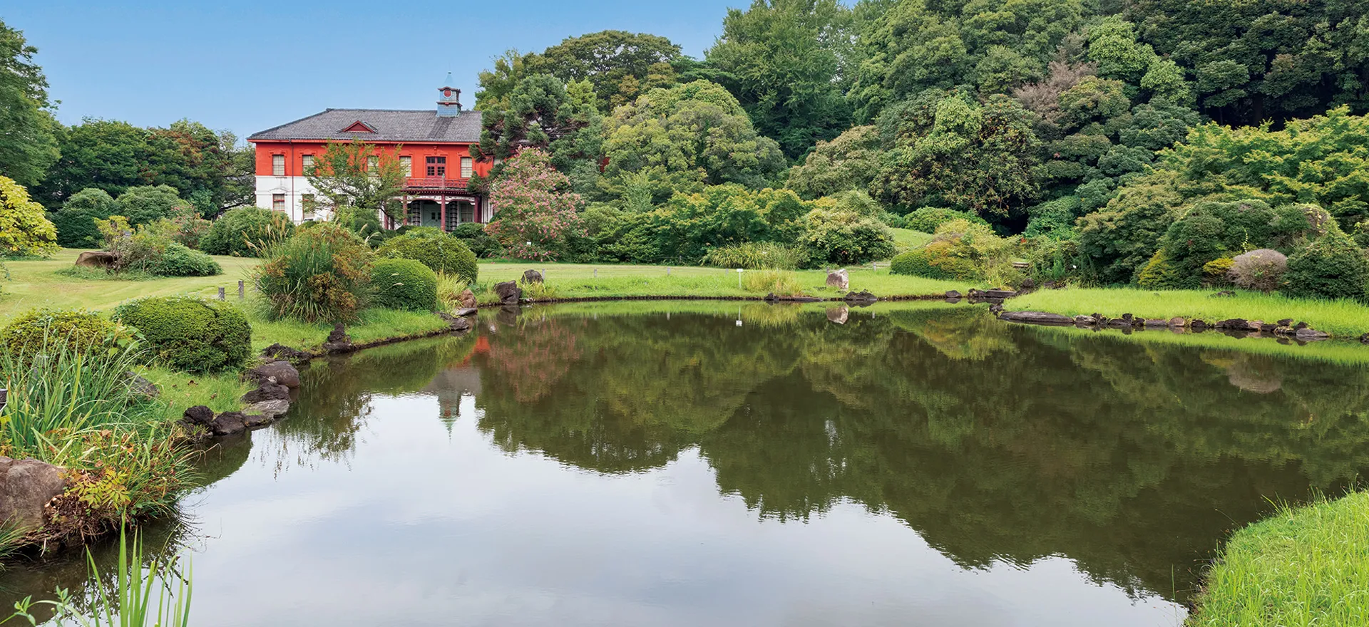低地に広がる日本庭園は、1652年に徳川綱吉が設けた別邸、白山御殿の庭園に由来する。池のほとりに建つのは、旧東京医学校本館だ。若き鴎外も学んだ。元は1876年に東大本郷キャンパスにあったが、1911年に赤門近くに移築された。関東大震災で本郷キャンパス内のほとんどが全半壊する中、大損害を免れる。1969年に現在地に移築され、国指定重要文化財となった。
