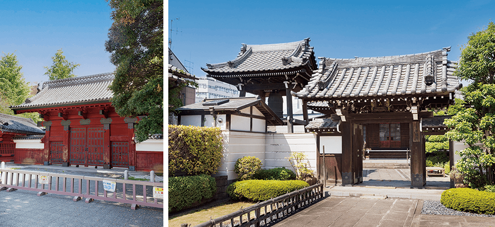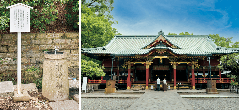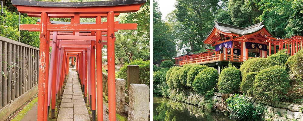右/根津神社の拝殿。平安時代に始まり江戸時代に流行した権現造りの手本と賞される建物だ