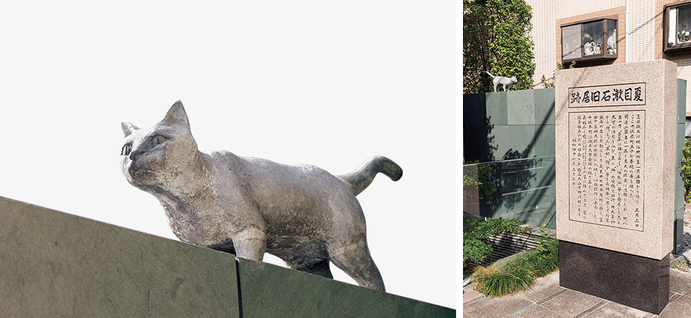 漱石が、イギリスから帰国後約3年間住んだのが現在の文京区向丘だ。根津神社の裏門から徒歩約5分の場所にある。現在は、夏目漱石旧居跡の石碑が立つ。最初の小説『吾輩は猫である』はここで執筆された。建物は"猫の家"の愛称で知られたが、現在は愛知県犬山市の明治村に移築されている。