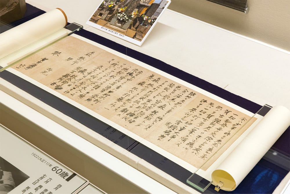 同館地下の展示室では、原稿や書簡、遺品をはじめとした貴重な所蔵資料が企画展示される。ついのすみかだったと物語る資料が遺言書だ。亡くなる3日前に、親友で医師の賀古鶴所に口述筆記させた。「余ハ石見人森林太郎トシテ死セント欲ス」「森林太郎墓ノ外一字モホル可ラス」と記される。最期は肩書から解放され、一人の人間でいたいと願った鴎外の思いが胸を打つ。