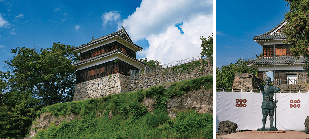 右/眞田神社には、西櫓を守るかのように青年時代の真田幸村像が立つ