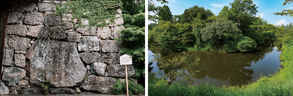 右/本丸の土塁は、鬼門である北東部分の角が削り取られ、滑らかになっている。隅欠(すみおとし)と呼ばれる鬼門除けだ