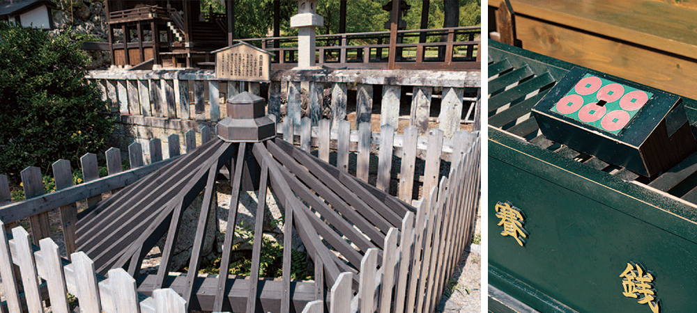 右/拝殿の参拝時、真田家の家紋である六文銭に手をかざすと鈴の音が鳴る