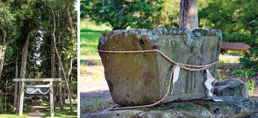 右/徳川家康の家臣、本多家から真田家に贈られたと伝わる御手水石。境内にそのままの姿で残る