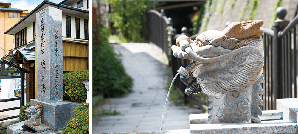 右/温泉水は飲用可能。街中でも竜を模した飲泉塔から自由に飲める