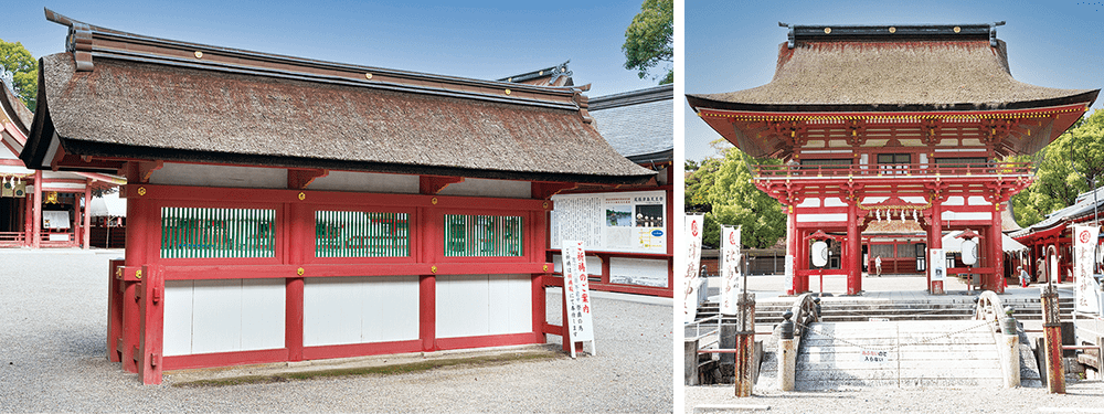 右/津島神社の実質的な正門である楼門。豊臣秀吉の寄進とされる。国指定重要文化財だ
