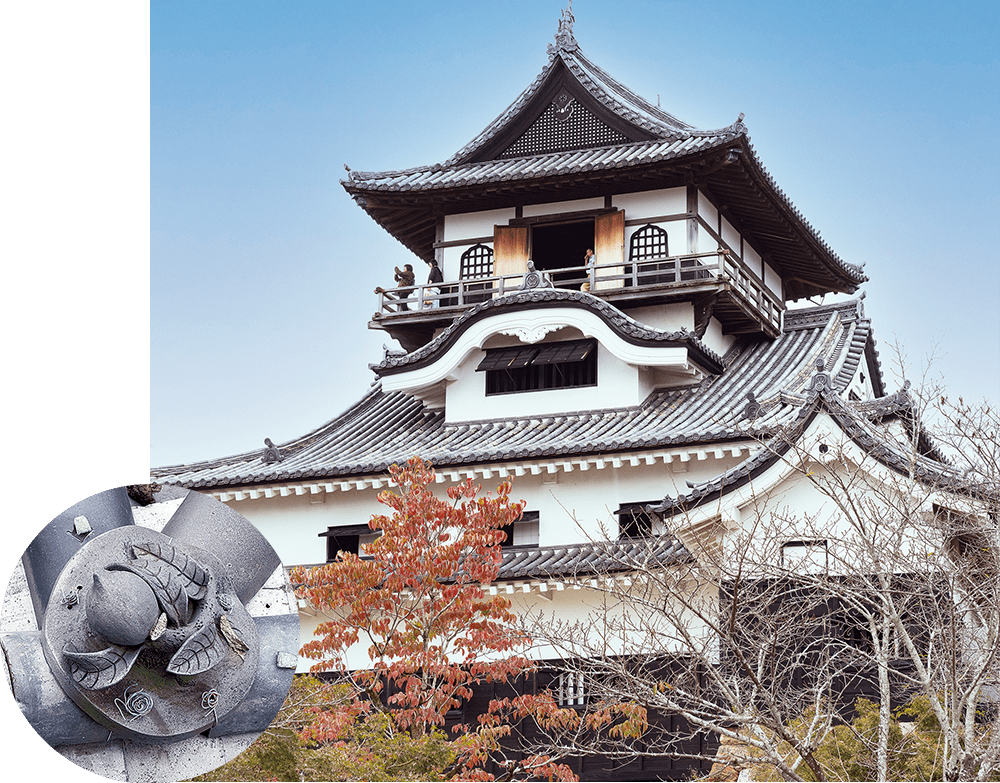 右/天守の中央を装飾する唐破風、最上階の両側にあしらわれた華頭窓が犬山城の優美な外観を演出する