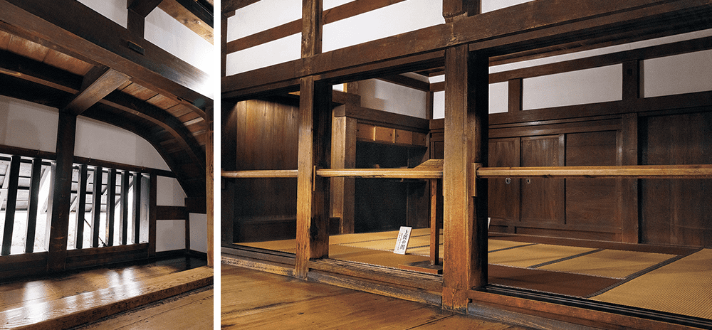 城内は無駄を省いた簡素な造りだ。1階の"上段の間"は主君が家臣に対面する場所だった。他より一段高い位置に造られ、兵が移動する廊下"