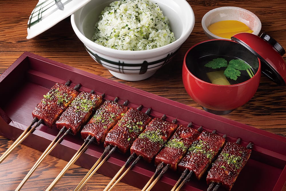 明治期から140年続く田楽専門店。数種類の八丁味噌をブレンドした秘伝の味噌ダレで、豆腐を香ばしく焼き上げる。豆腐は富山・新潟のエンレイや岐阜のフクユタカなど厳選された大豆で作られる。季節の葉の塩漬けを刻み入れた菜飯との相性が抜群だ。