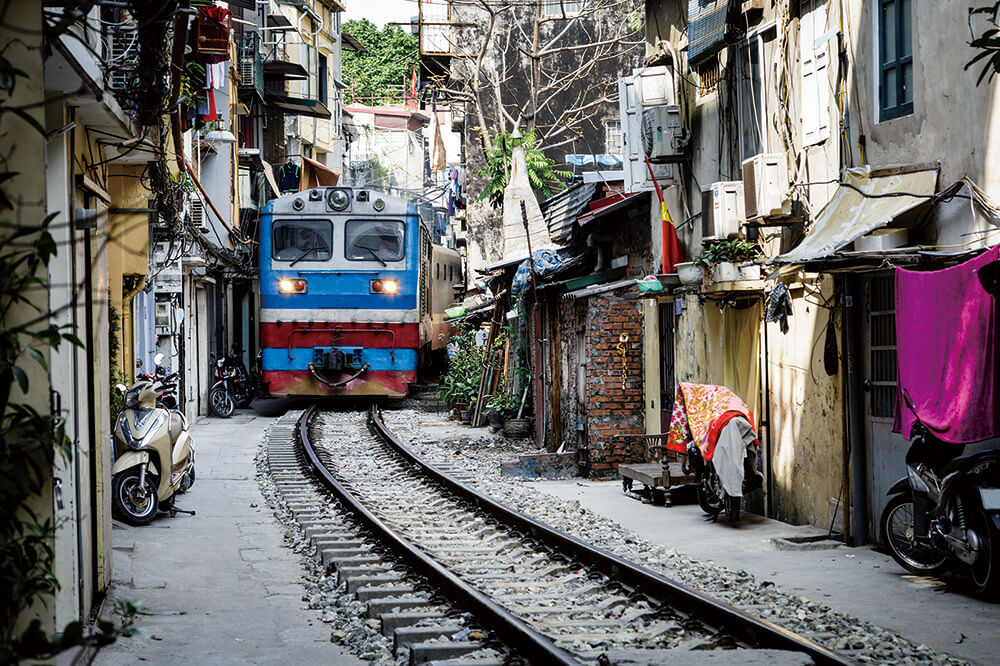 建物スレスレを走る電車はハノイの観光名所の一つ