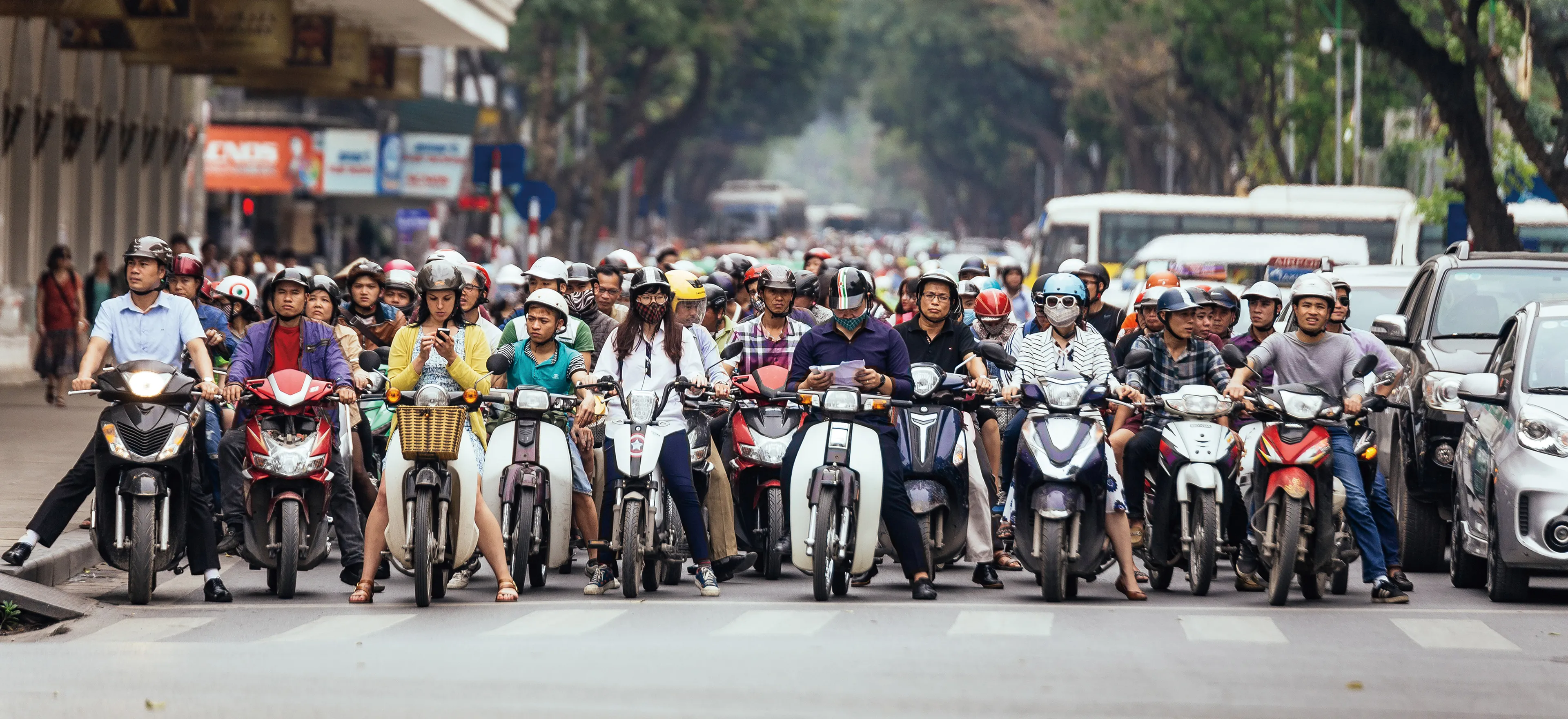 ベトナムでは歩行者より車両が優先される。そのため、歩行者は信号のあるなしにかかわらず、洪水のような車両の流れの中を横断する。広い通りを泰然自若とした様子で道路を渡る高齢者も多い。危険な行為には違いないが、バイクと横断者の間には"あうんの呼吸"がある。横断者のスピードを見越しながら、巧みに走り抜けるバイクの様子は見事ともいえる。ただし、自動車はこうした動きが難しい。今後は車が増えるにつれ、こうした絶妙なコンビネーションは変化するかもしれない。