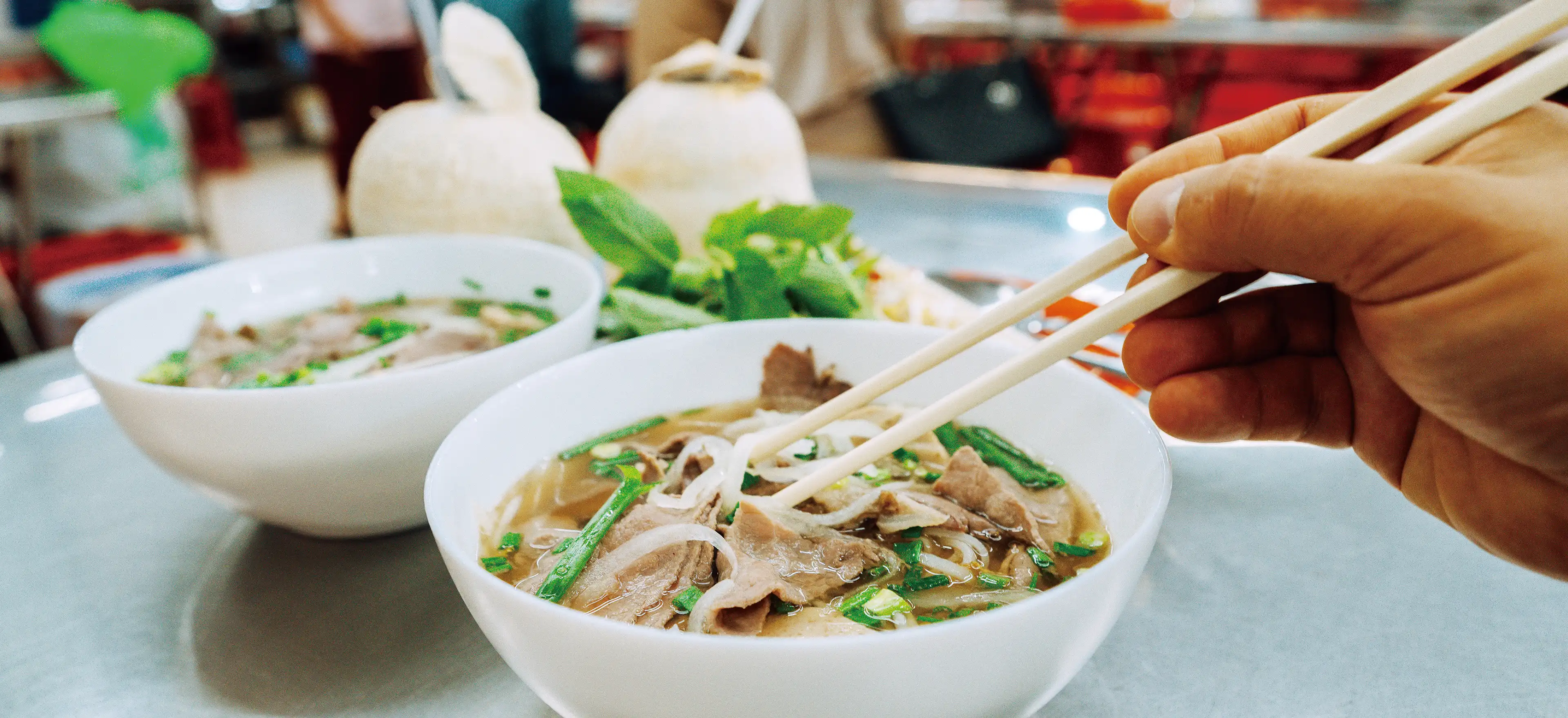 麺に使われるスープは、野菜のゆで汁や肉類、魚介類のだしを生かしたシンプルな味わいに仕上げている。ほとんどの飲食店では料理を注文すると、コショウ、サテ(ベトナム風ラー油)、酸味を足すためのかんきつ類といった調味料セットが付いてくる。味付けが物足りない場合は、自分で好みの味に調整するのがベトナム流だ。
