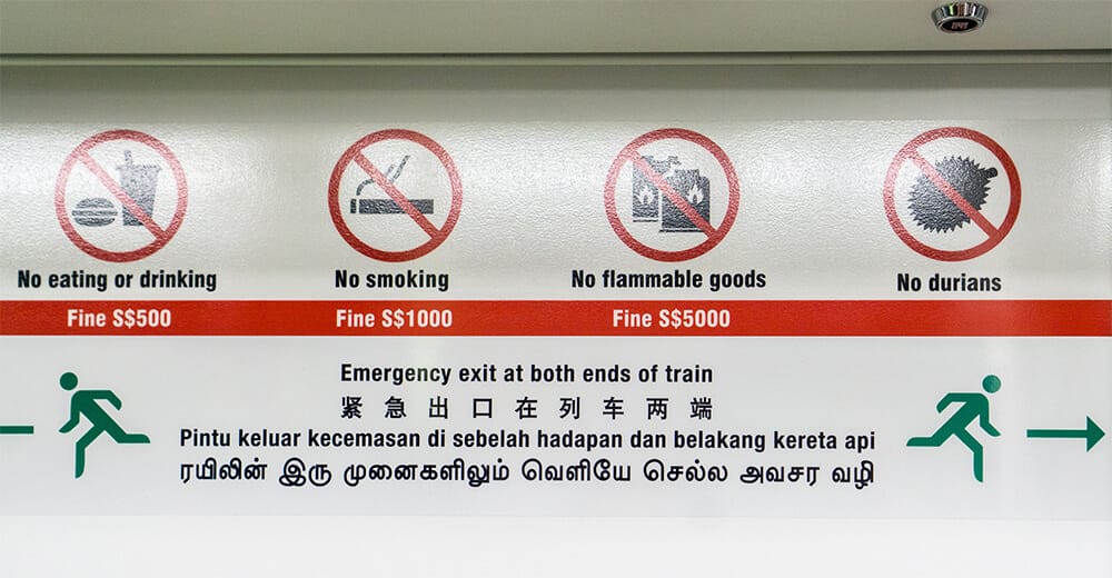シンガポールの地下鉄に掲示された注意書き。地下鉄へのドリアン持ち込みも禁止だ