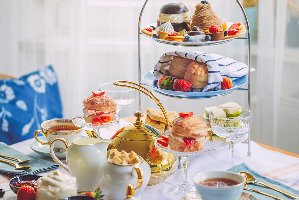 アフタヌーンティーは上段にペストリー、中段にスコーン、下段にサンドイッチと配置されるのが一般的で、下段のサンドイッチから食べていくのが基本的なマナーだ